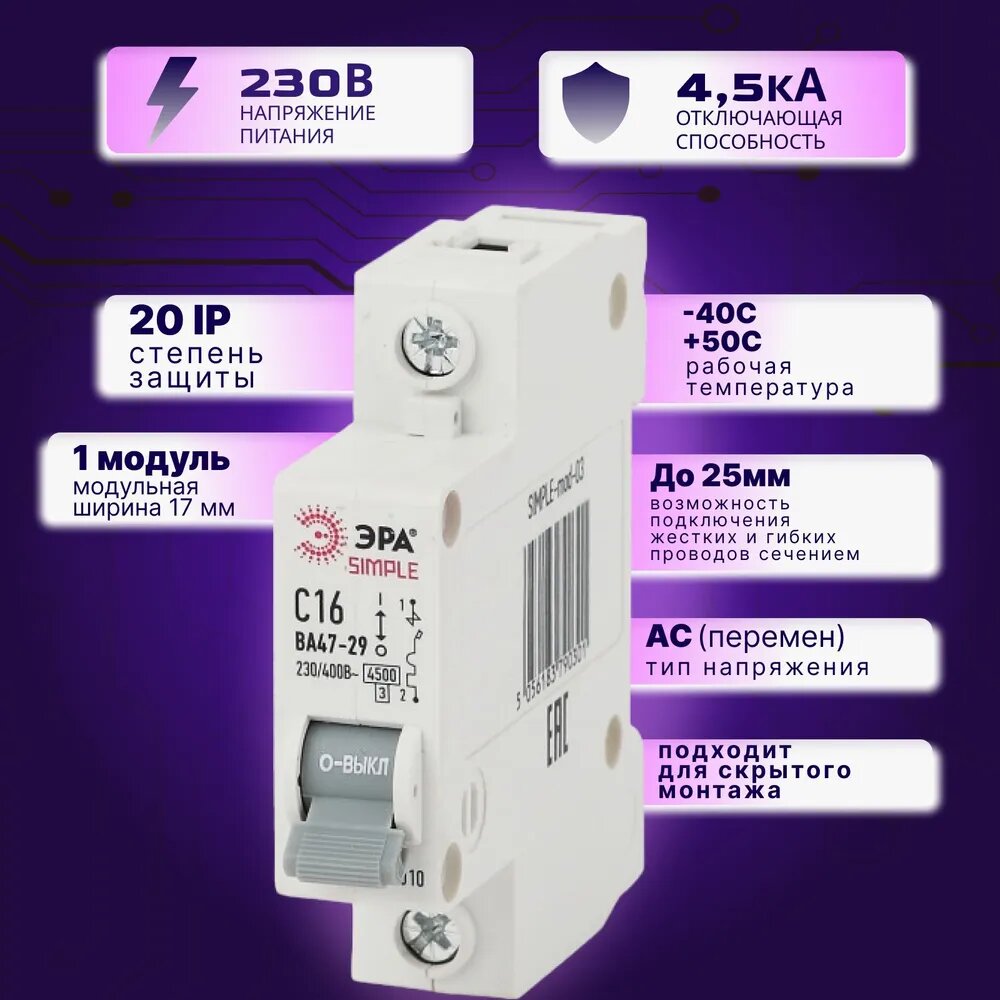 Автомат Б0039220 ЭРА SIMPLE-mod-03 1P 16А (С) выключатель ВА 47-29 4шт. информация: