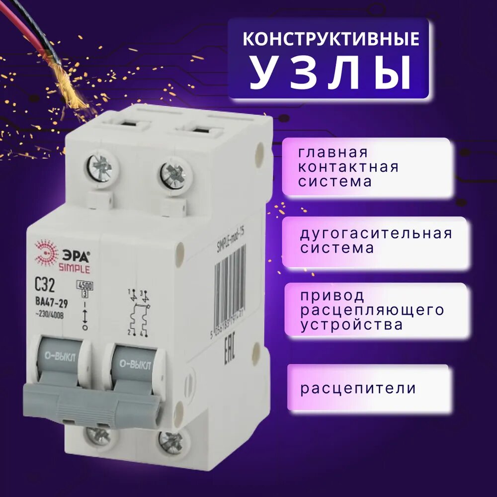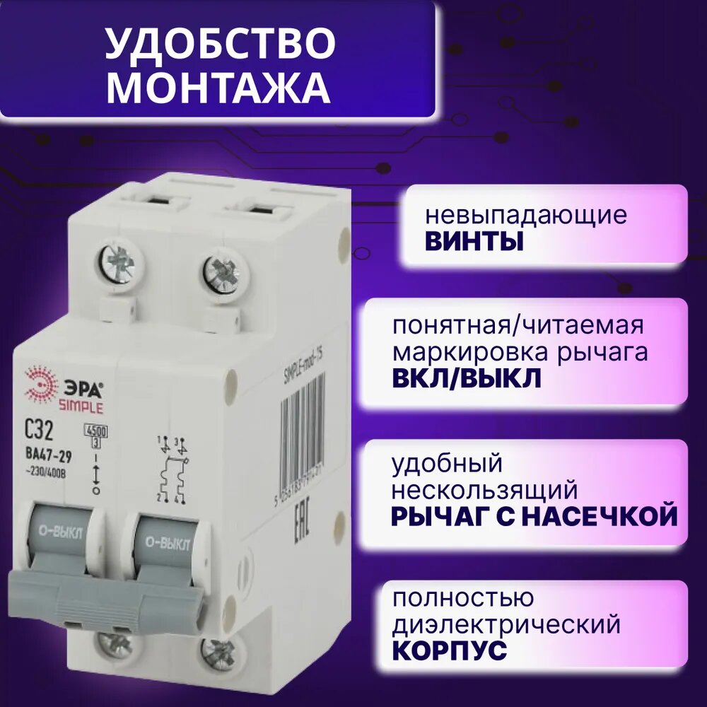Автомат Б0039232 ЭРА SIMPLE-mod-15 2P 32А (C) 4,5кА выключатель ВА 47-29 2шт информация: