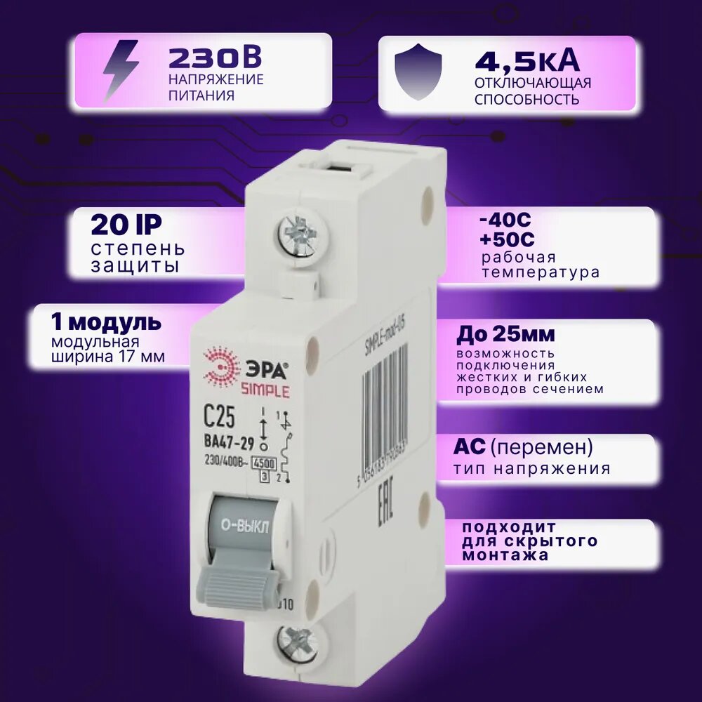 Автомат Б0039222 ЭРА SIMPLE-mod-05 1P 25А C выключатель ВА 47-29 5шт информация: