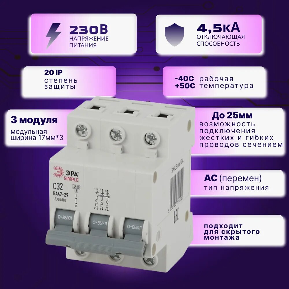 Автомат Б0039241 ЭРА SIMPLE-mod-24 3P 32А (C) выключатель ВА 47-29 4шт информация: