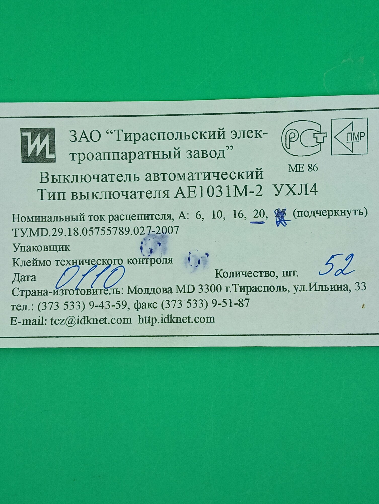 Выключатель автоматический АЕ 1031 20А Тирасполь информация: