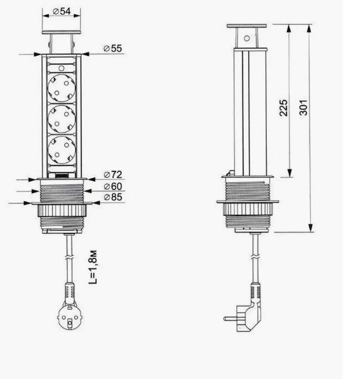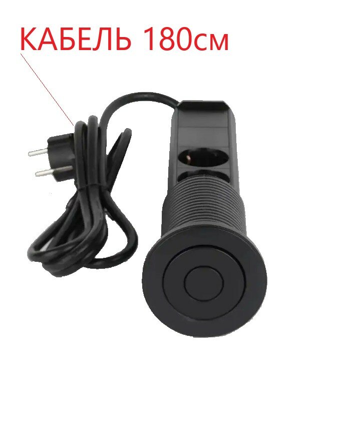 Встраиваемая выдвижная розетка в столешницу для кухни, на 3 розетки, с кабелем 1.8 м с вилкой, черная
