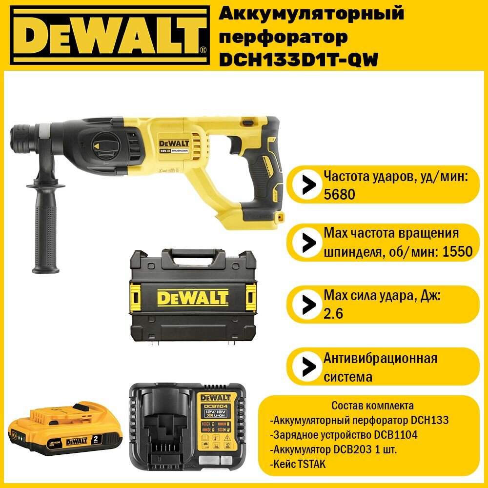Аккумуляторный перфоратор Dewalt DCH133 D1 (1 АКБ 2 Ач XR и ЗУ в кейсе TSTAK) информация: