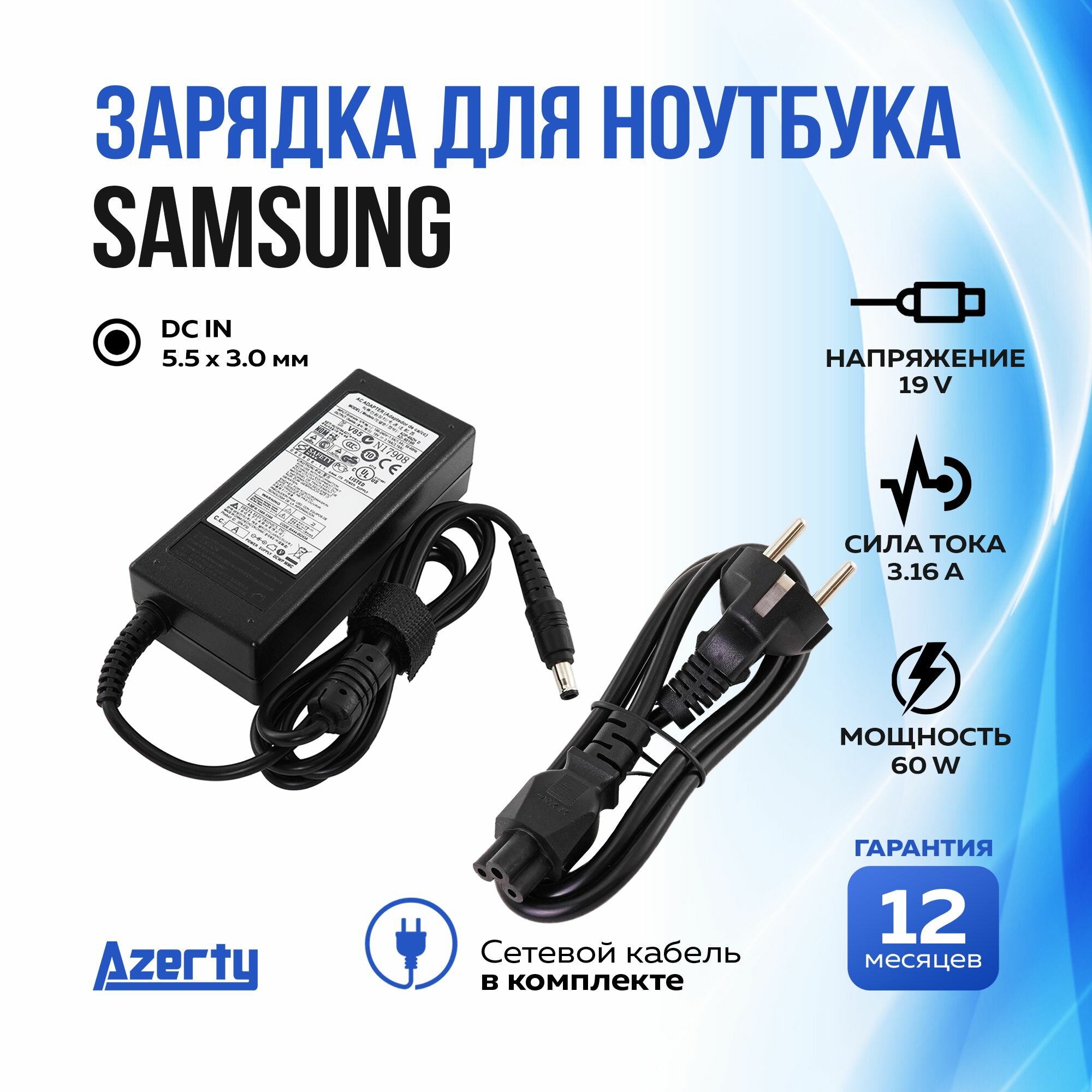 Зарядка для ноутбука Samsung 19 В 3.16 А (60 Вт) 5.5x3.0 мм с кабелем питания информация: