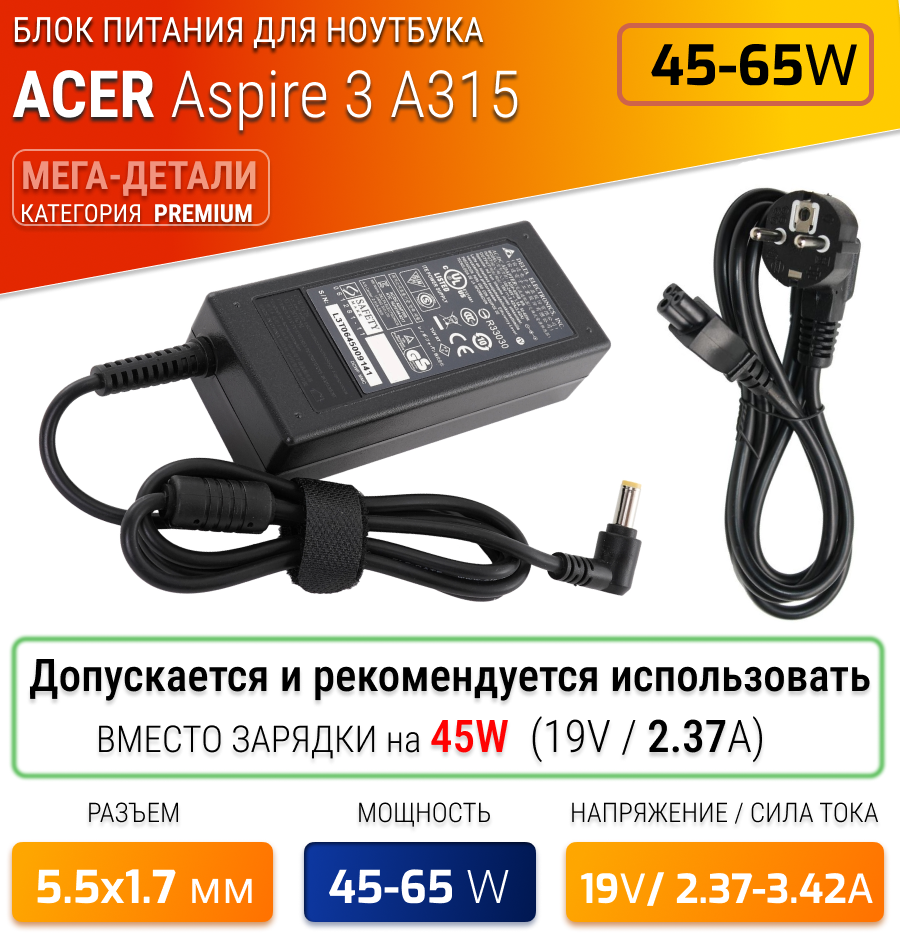 Мы выбрали 10 лучших цен на Зарядка для ноутбука Acer Aspire 3 A315-21 (версия с разъемом 5.5x1.7mm). Перед тем как купить Зарядка для ноутбука Acer Aspire 3 A315-21 (версия с разъемом 5.5x1.7mm) посмотрите найденные предложения из Яндекс Маркета и других сайтов на основе XML фидов.
