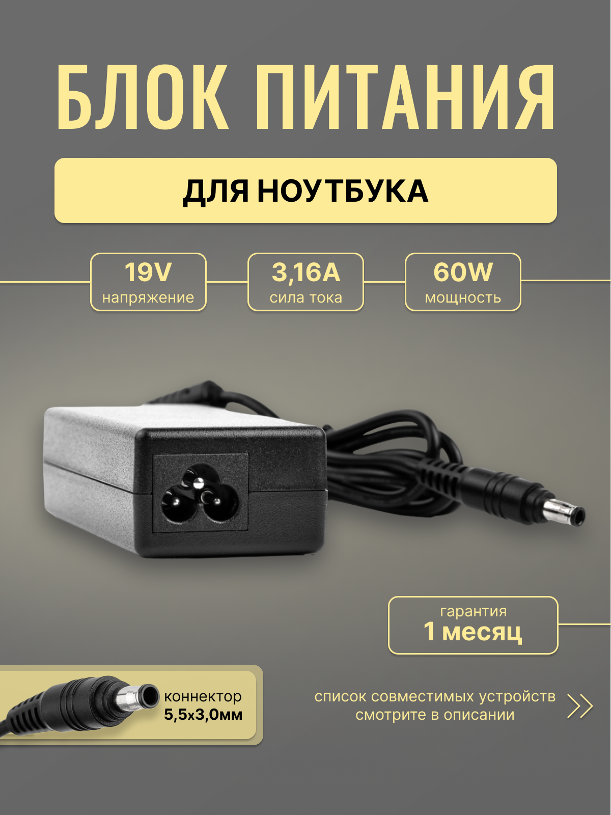 Зарядка 5,5x3,0mm 19V 60W 3,16A для Samsung R540, R525, NP300E5A, RV520, R530 без сетевого кабeля информация: