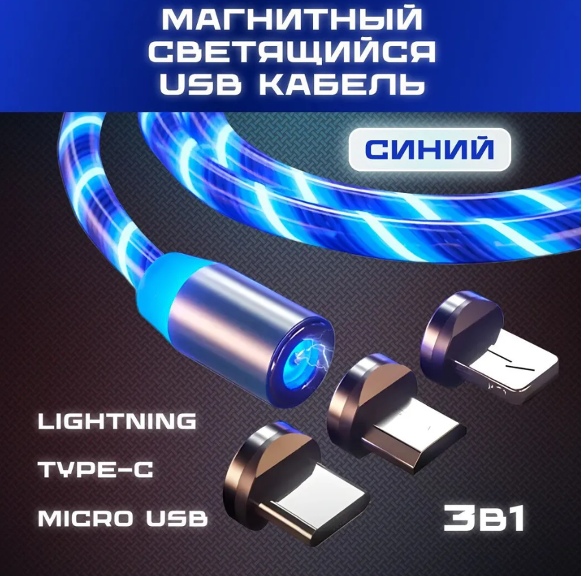 Магнитный светящиеся синий кабель 3в1/Lighting-Type C-Micro USB информация:
