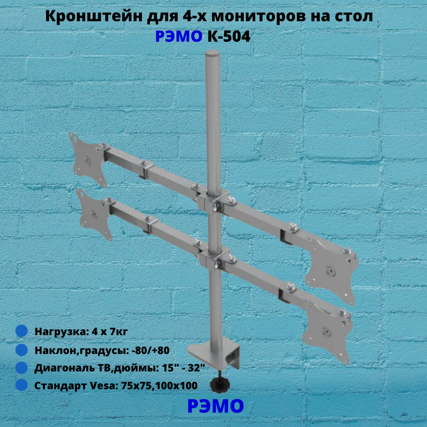 Кронштейн для четырех мониторов на стол наклонно-поворотный с диагональю от 15"до 32" Рэмо К-504,металлик информация: