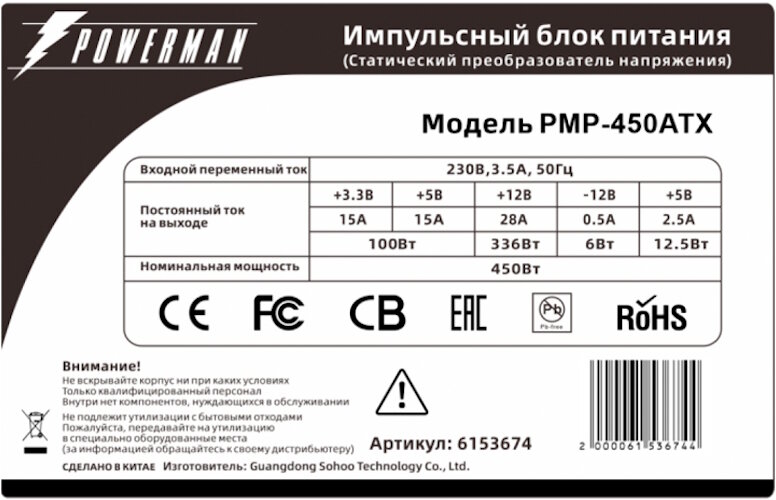 Блок питания Powerman PMP-450ATX 450 Вт информация: