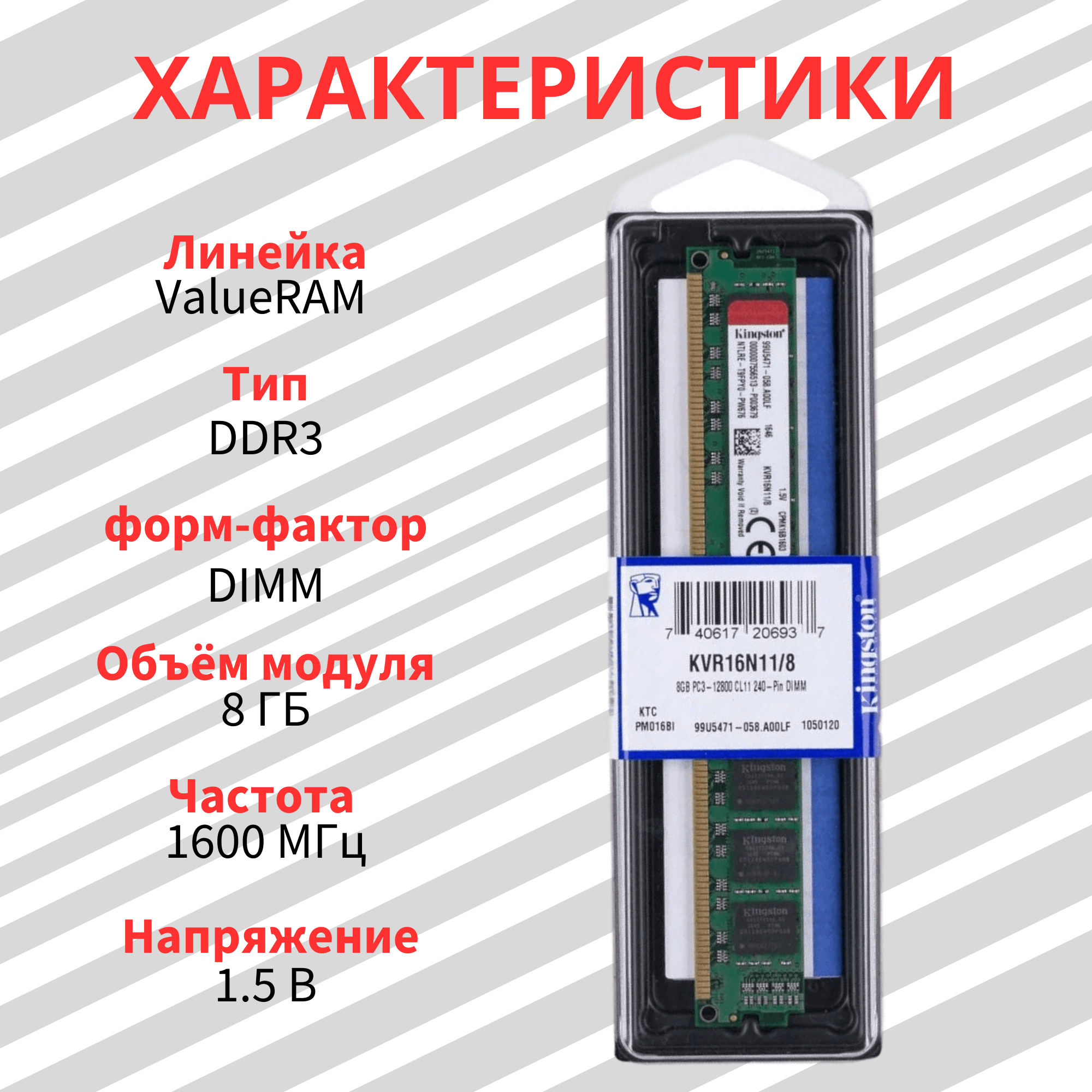 Оперативная память Kingston DDR3 8GB 1600Мгц 2Rx8 1.5v DIMM для ПК низкопрофильная