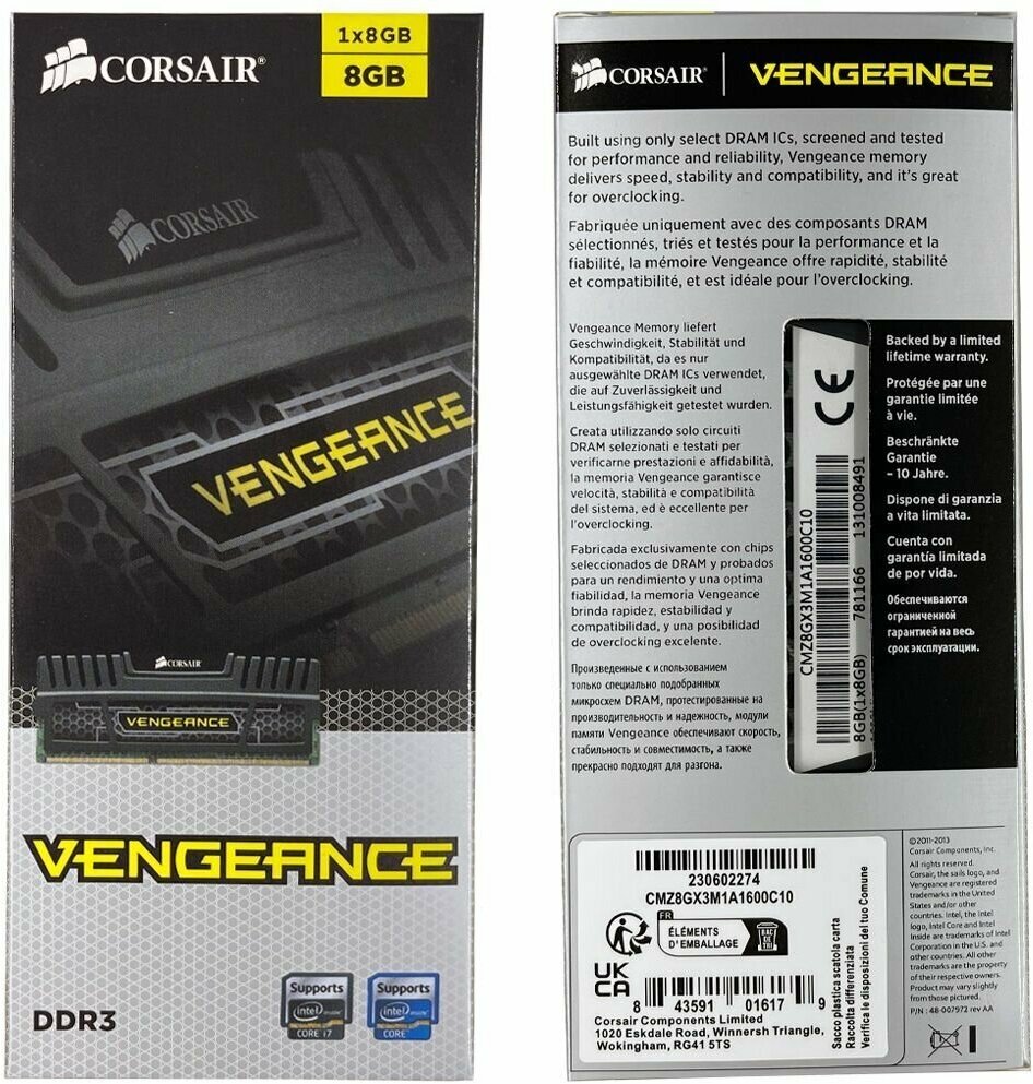 Оперативная память Corsair Vengeance DDR3 1600 Мгц 1x8 ГБ DIMM c Радиатором охлаждения. информация:
