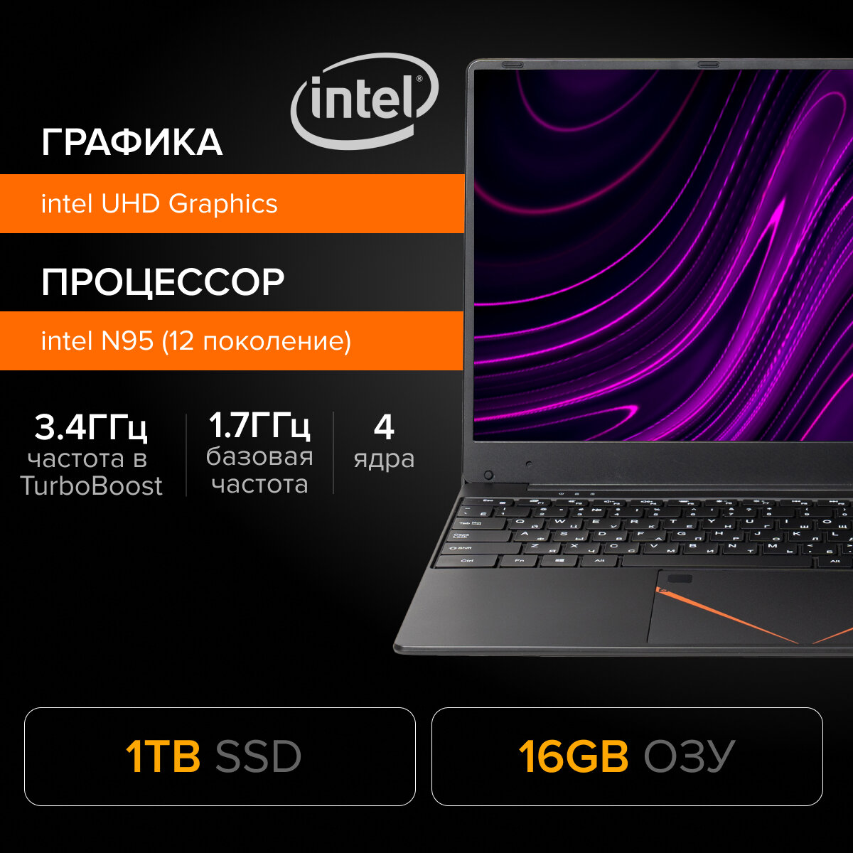 15,6 ноутбук RGB Intel Celeron N95 (3.4 GHz, 4 ядра), RAM 16 GB, SSD 1 TB, Intel UHD Graphics, Windows 11 Pro информация: