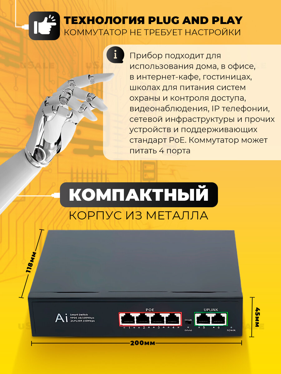 PoE коммутатор 4 порта POE + 2 uplink 100mbit 802.3 af/at 60 ватт питание для видеонаблюдения ip телефонии камер