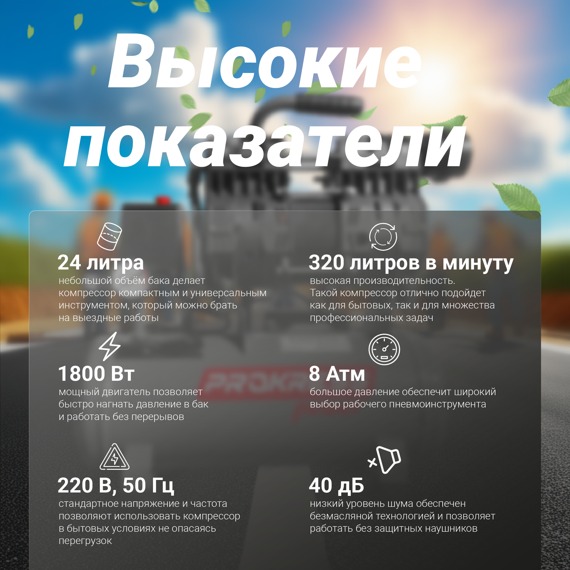 Компрессор PROKRESS Breeze 24/320 ( 1,8 кВт, 320 л/мин, бак 24л, 8 атм) информация: