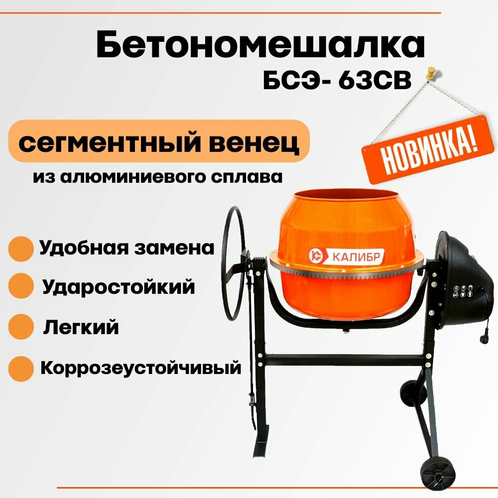 Бетоносмеситель Калибр БСЭ- 63СВ сегментный венец из алюминиевого сплава, объем 63 литров, мощность 375 Вт, бетономешалка строительная
