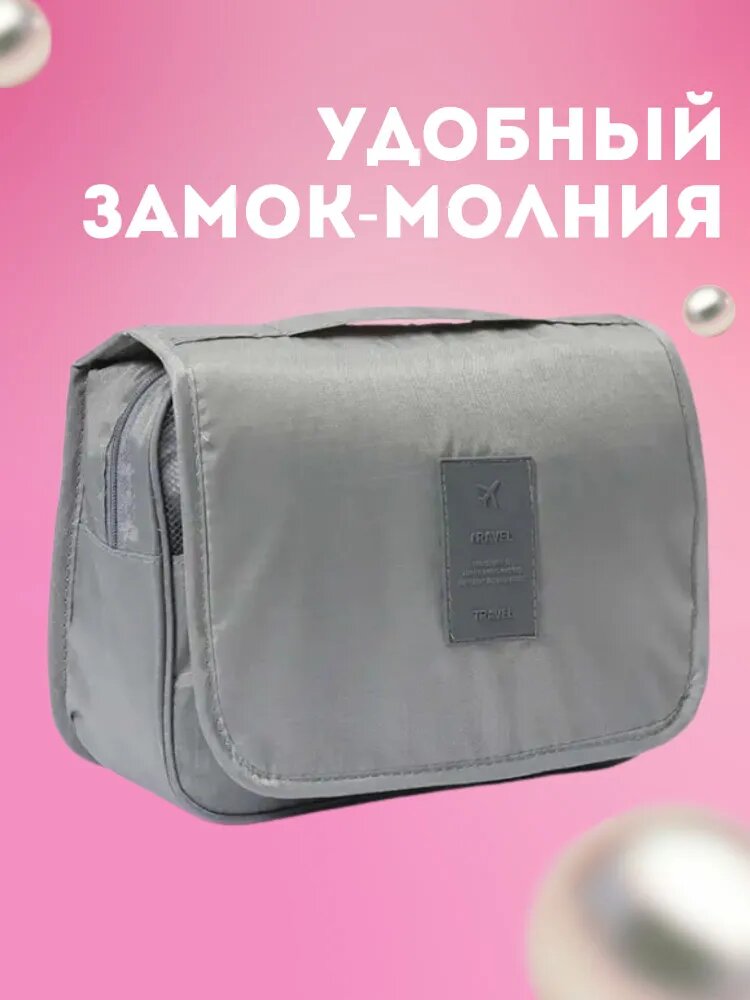 10 цен на Косметичка TRAVEL на молнии, 10х18х24 см, ручки для переноски, крючок для подвешивания, водонепроницаемая, серый