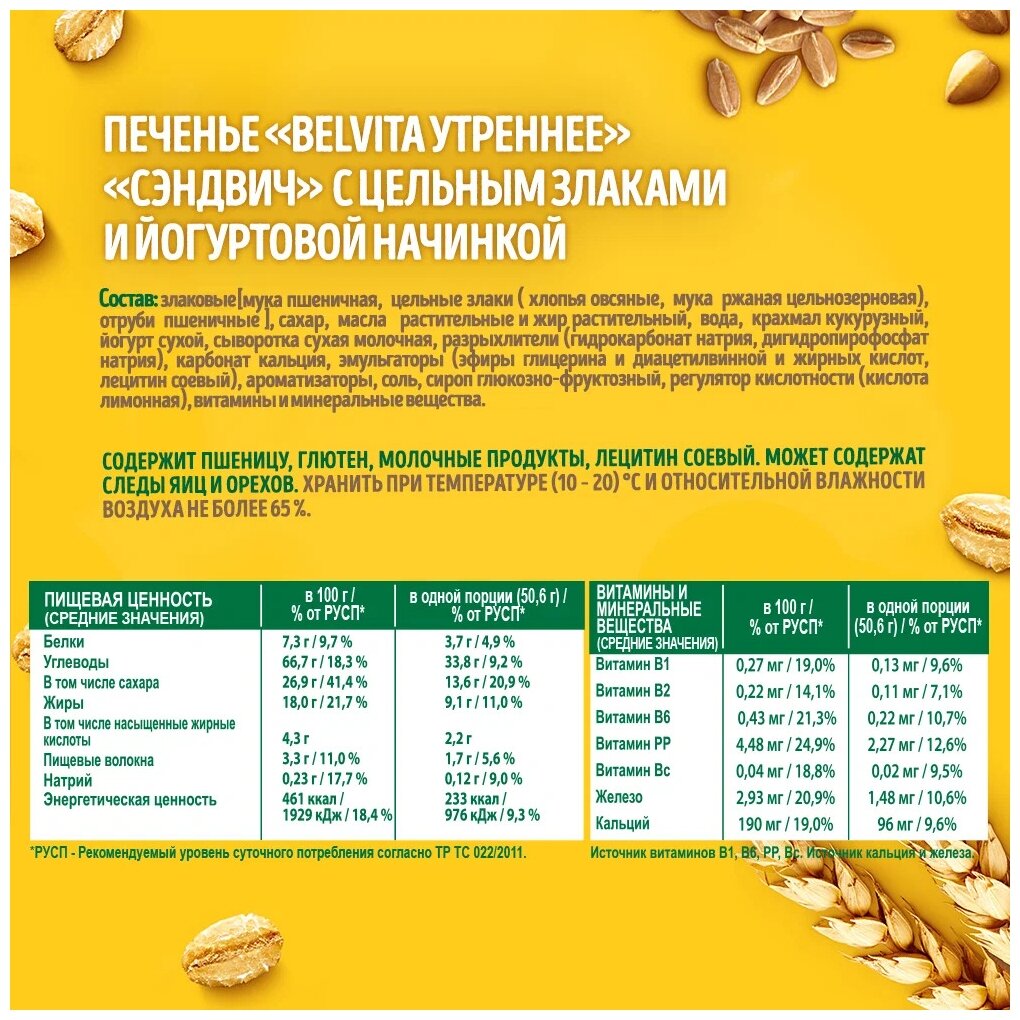 BELVITA Сэндвич печенье Утреннее витаминизированное с цельными злаками и йогуртовой начинкой 253г информация: