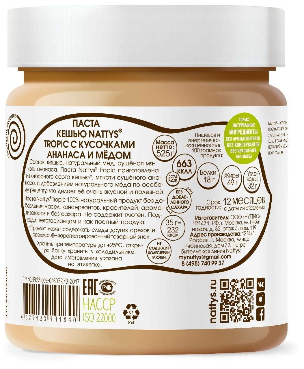 Паста кешью Nattys® Tropic с кусочками ананаса и мёдом 525 гр информация: