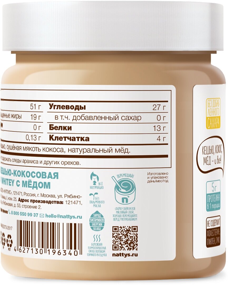 Паста кешью-кокосовая Nattys® Whitey с мёдом 525 гр информация:
