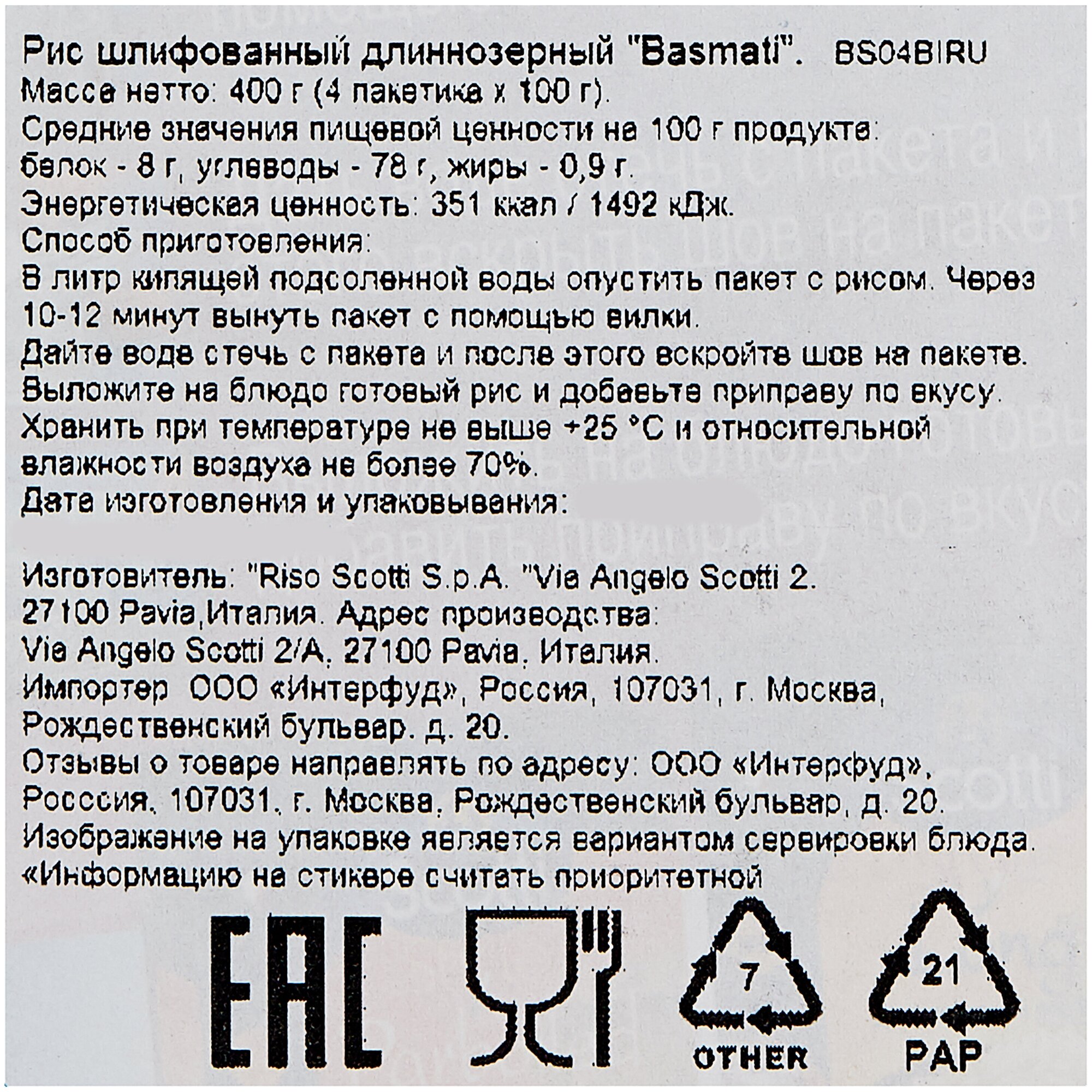 Рис Riso Scotti Basmati шлифованный длинный, 4 пакетика по 100 г информация: