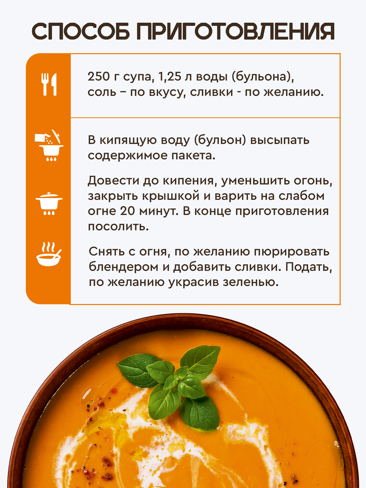 | Способ приготовления | Высыпать содержимое пачки в 1,25 л воды или бульона, закрыть крышкой и варить на медленном огне в течение 25 минут, в конце приготовления добавить соль. При желании можно дополнительно придать консистенцию пюре блендером и добавить сливки в качестве нежного соуса. |