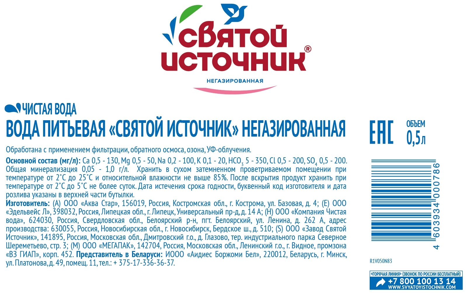Святой Источник негазированная, 3+1 по 0,5 л промо-пак информация: