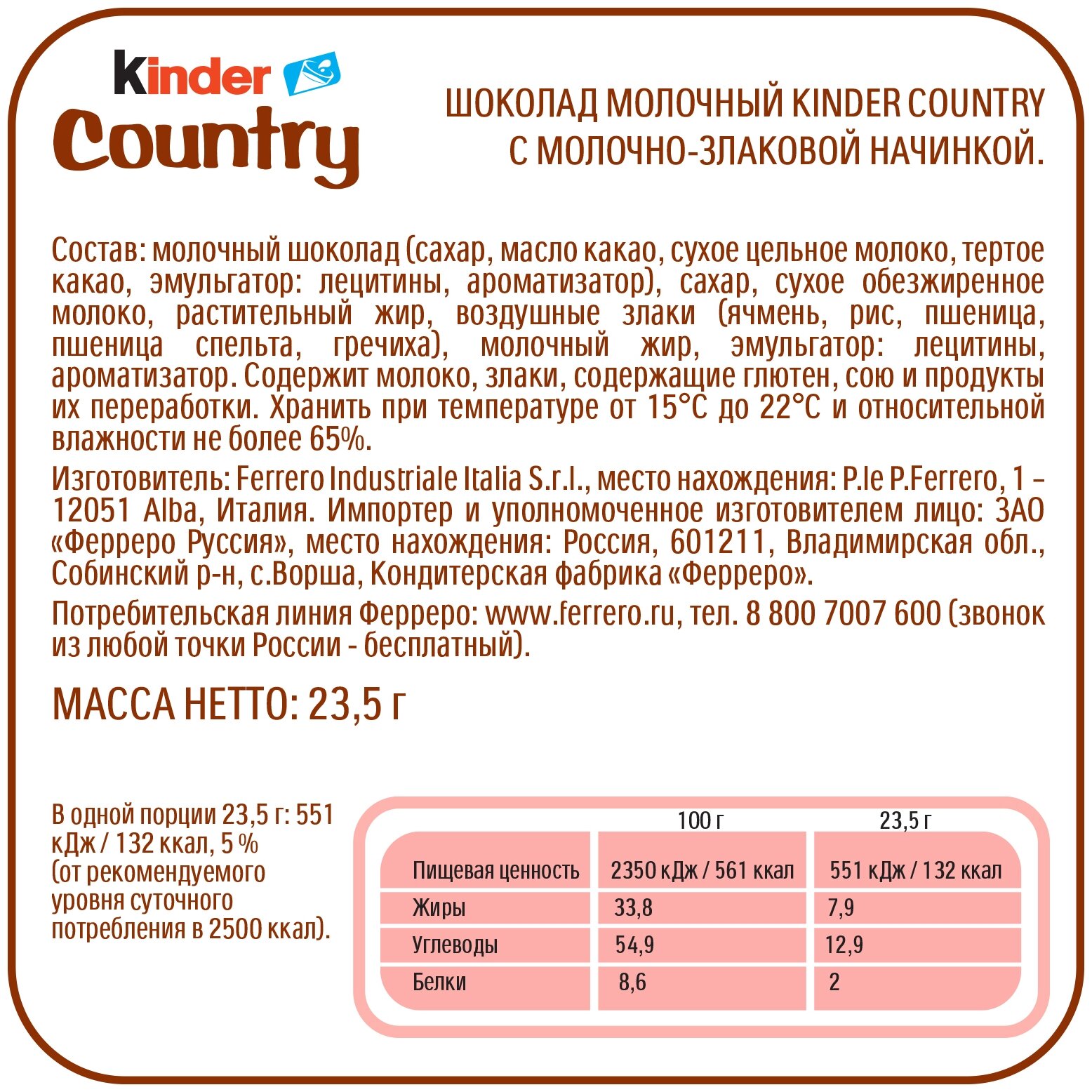 | Состав | молочный шоколад (сахар, масло какао, сухое цельное молоко, тертое какао, эмульгатор: лецитины, ароматизатор), сахар, сухое обезжиренное молоко, растительный жир, воздушные злаки (ячмень, рис, пшеница, пшеница спельта, гречиха), молочный жир, эмульгатор: лецитины, ароматизатор |