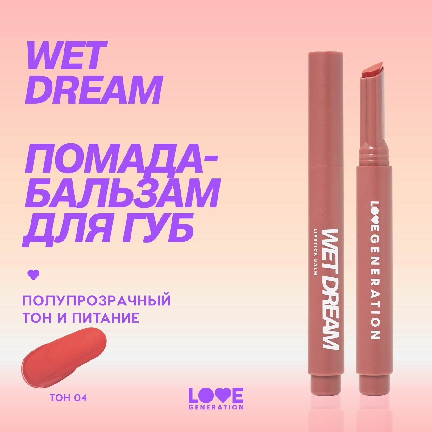 Помада-бальзам Love Generation Wet Dream тающая текстура, глянцевый финиш, тон 02, розово-персиковый, 1,4 г