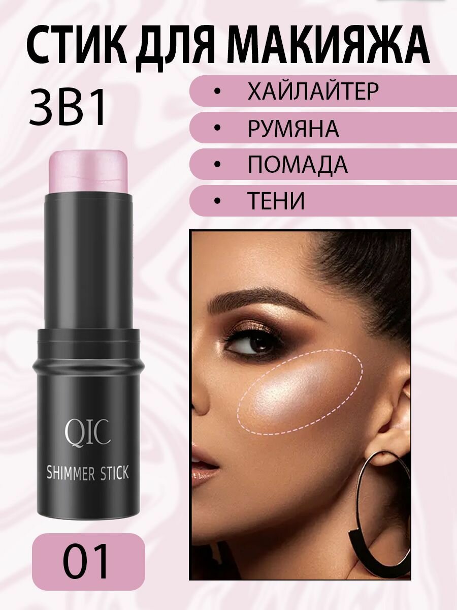10 цен на Кремовые румяна стик QIC 3 в 1 хайлайтер для лица, помада, тени для макияжа, тон 01