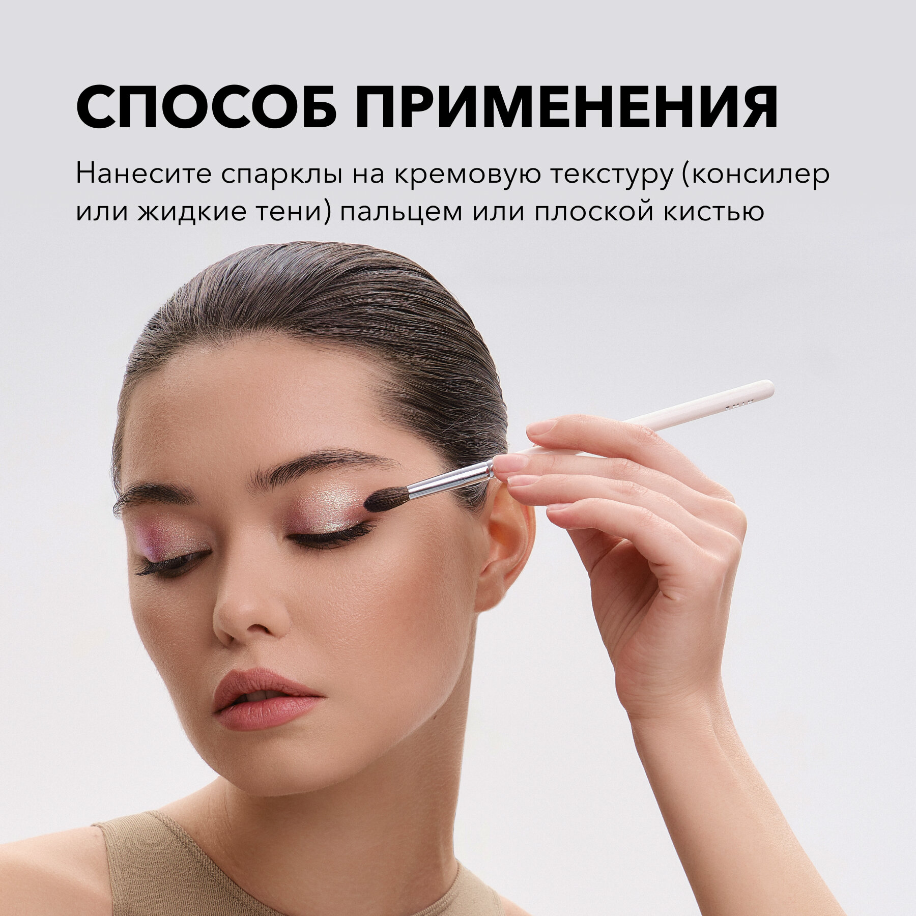| Способ применения | 1. Нанесите спарклы на кремовую текстуру (консилер или жидкие тени) пальцем или плоской кистью. 2. Растушуйте. |