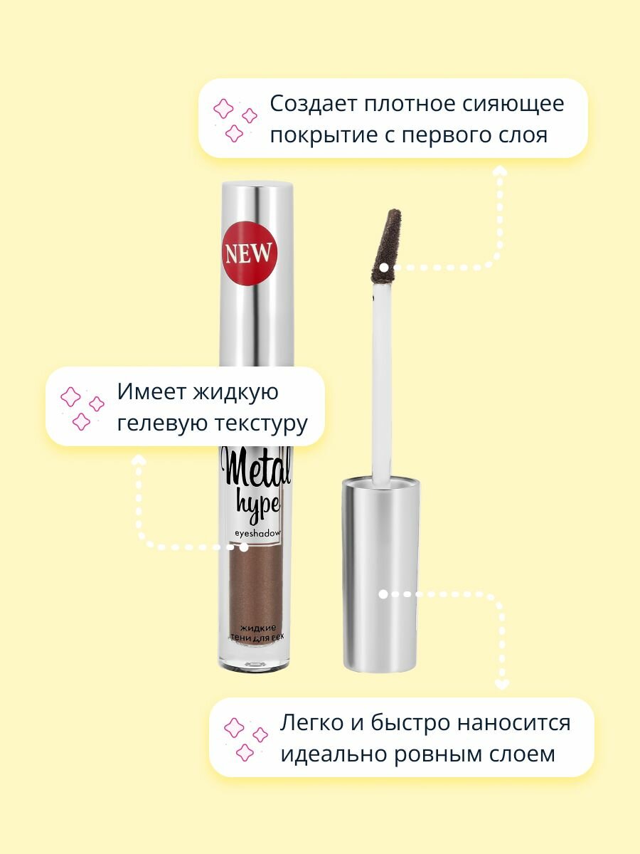 | Дополнительная информация | Жидкие тени для век Metal hype стойкие с металлическим сиянием. Насыщенные цвета с высоким содержанием перламутровых пигментов создают плотное мерцающее покрытие с первого слоя. Тени быстро высыхают, равномерно наслаиваются и растушевываются, сохраняют яркость цвета и сияние до 12 часов. Не требуют базы под тени. Содержат увлажняющие и смягчающие компоненты. |