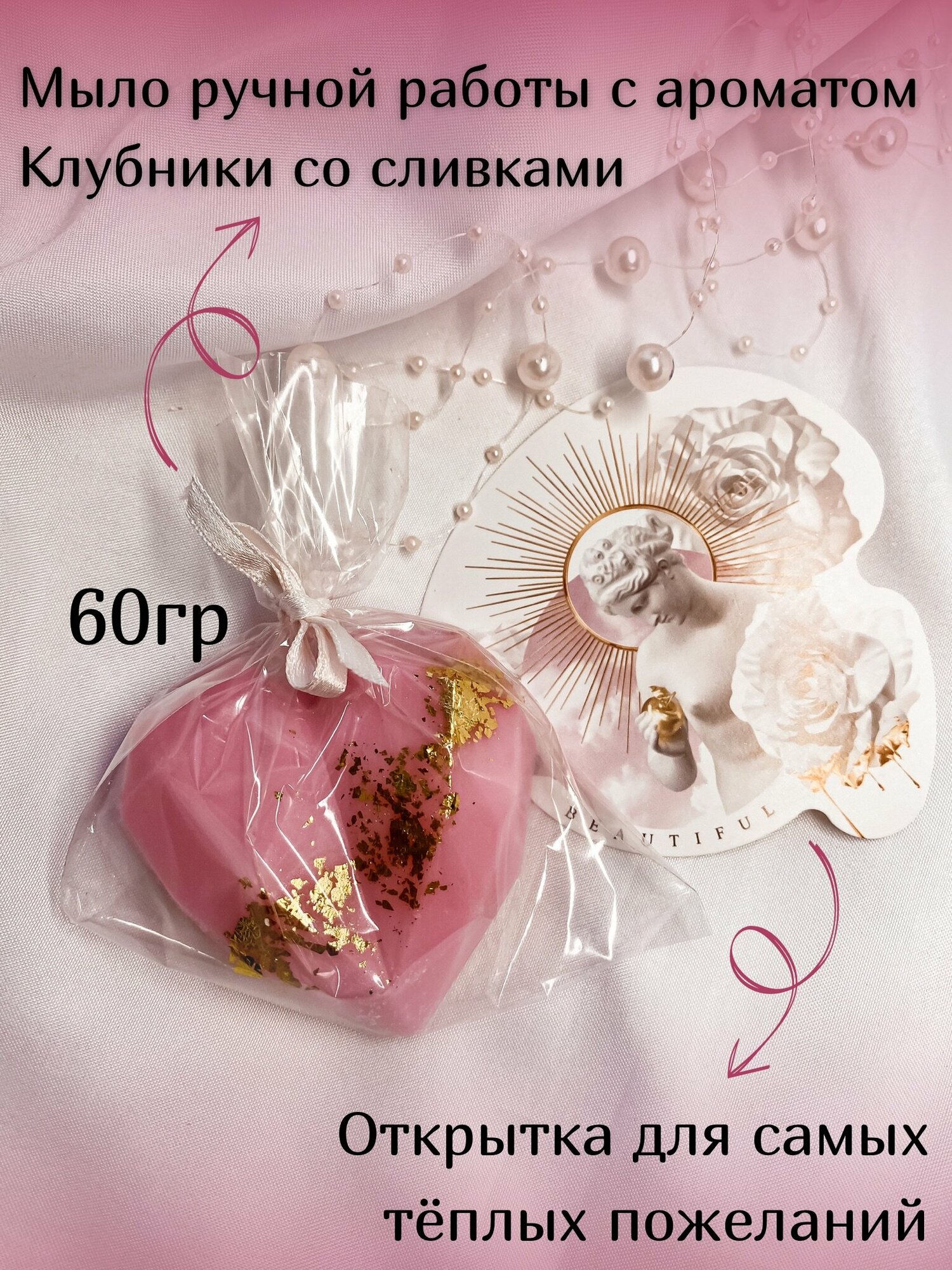 | Состав | Бомбочка для ванны ,Глицериновое мыло / Свеча из вощины / Морская соль с шиммером и сухоцветами розы / Открытка |