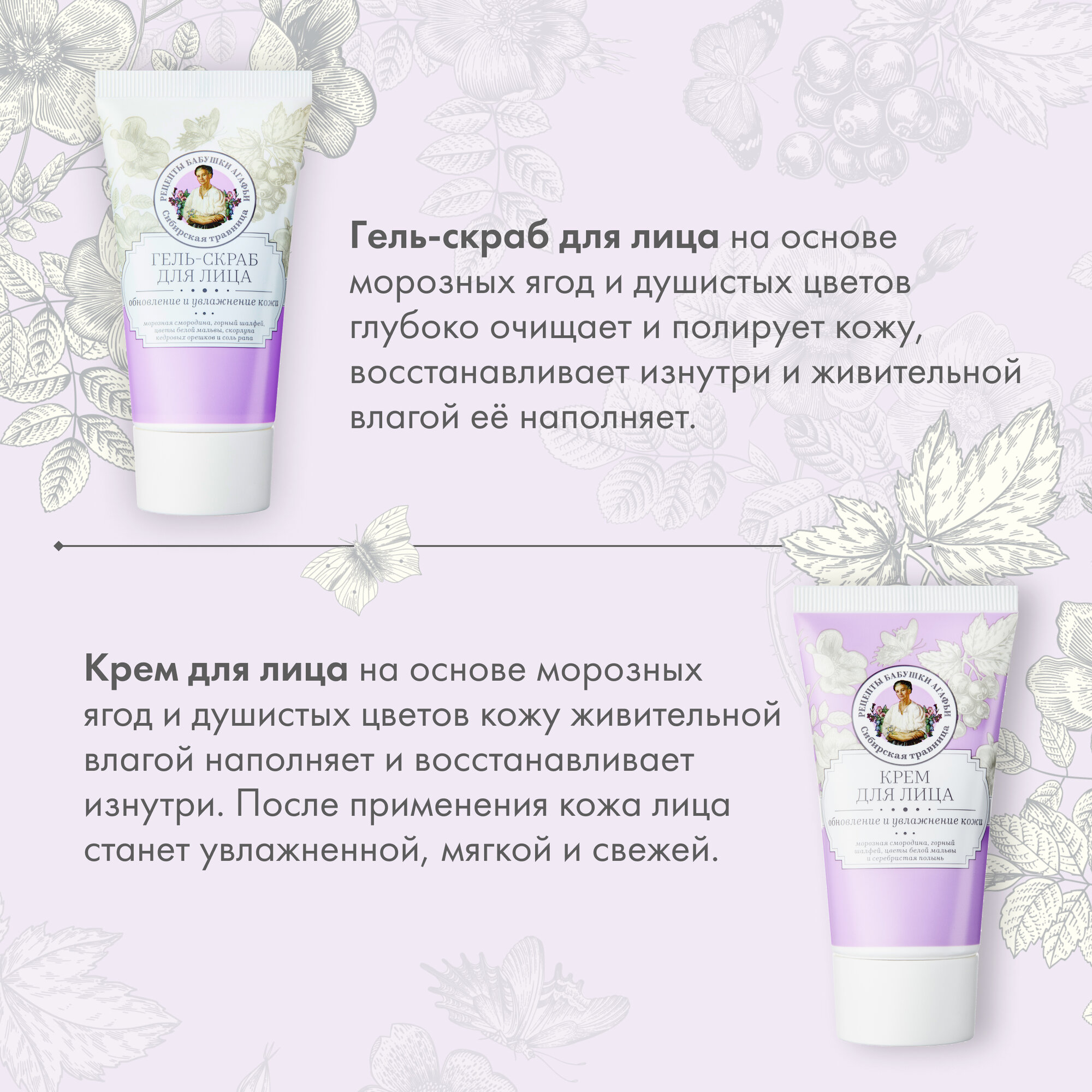 | Способ применения | Гель-скраб для лица "Обновление и увлажнение кожи" Способ применения: используйте гель-скраб для лица регулярно, раз или два в неделю: нанесите на хорошо увлажнённое лицо, слегка помассируйте и смойте прохладной водой. Увидите, как кожа засияет да засветится! Меры предосторожности: избегайте попадания в глаза. В случае попадания в глаза, промойте их большим количеством воды. Только для наружного применения. Крем для лица "Обновление и увлажнение кожи" Способ применения: нанесите крем на очищенную кожу лица. Меры предосторожности: возможна индивидуальная непереносимость натуральных компонентов. Только для наружного применения. |