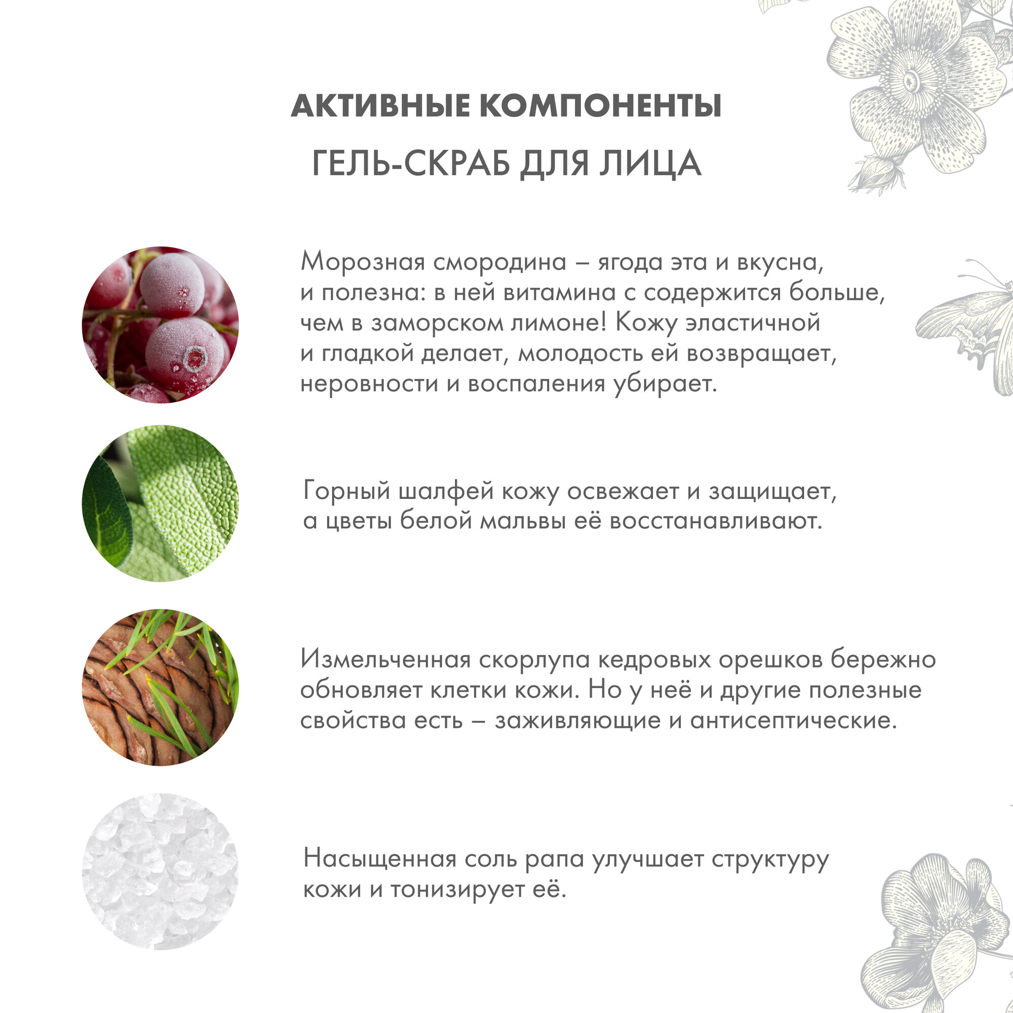 | Состав | Гель-скраб для лица "Обновление и увлажнение кожи": Aqua with infusion of Ribes Nigrum Fruit Extract (экстракт смородины) / Salvia Officinalis Leaf Extract (экстракт шалфея горного) / Malva Sylvestris Flower Extract (экстракт цветов мальвы) / Sodium Chloride (соль рапа); Pinus Sibirica Shell Powder (скорлупа кедровых орешков) / Silica / Heptyl Glucoside / Benzyl Alcohol / Ethylhexylglycerin / Acrylates/C10-30 Alkyl Acrylate Crosspolymer / Sodium Hydroxide / Parfum / CI 14720 / CI 42051 / Hexyl Cinnamal. Крем для лица "Обновление и увлажнение кожи": Aqua with infusion of Ribes Nigrum Fruit Extract (экстракт смородины) / Salvia Officinalis Leaf Extract (экстракт шалфея горного) / Malva Sylvestris Flower Extract (экстракт цветов мальвы) / Artemisia Vulgaris Extract (экстракт полыни); Octyldodecanol / Caprylic/Capric Triglyceride / Coco-Caprylate/Caprate / cetearyl alcohol / Glyceril Stearate / niacinamide / Olive Glycerides / Ceramide NP (комплекс церамидов) / Sodium Hyaluronate / Tocopherol (Витамин Е) / Sodium Stearoyl Glutamate / Sodium Carbomer / Xanthan Gum / Citric Acid / Benzyl Alcohol / Ethylhexylglycerin / Parfum / CI 14720 / CI 42051 / Hexyl Cinnamal. |