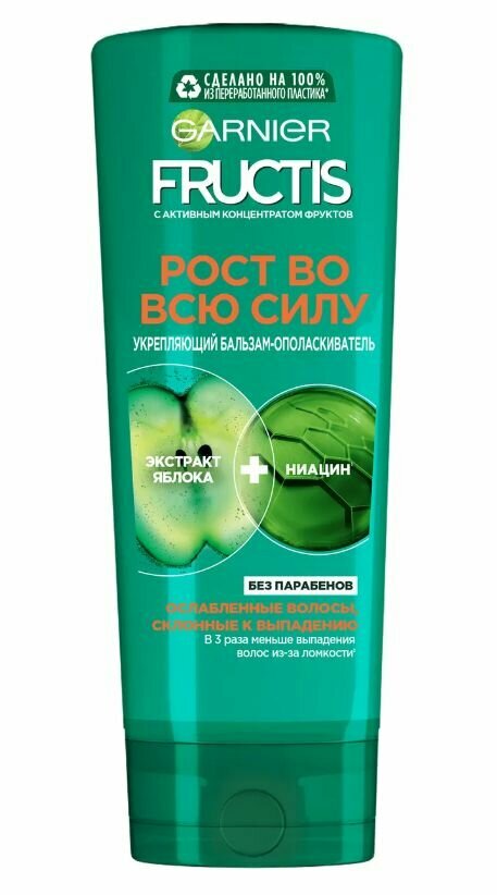 Garnier Fructis Бальзам-ополаскиватель для волос Рост во всю Силу укрепляющий для ослабленных волос, склонных к выпадению, с экстрактом яблока и ниацином, 387 мл