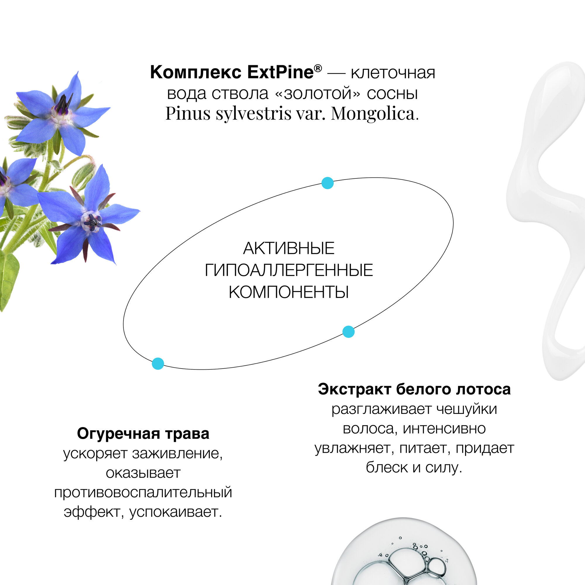 | Способ применения | Aqua with infusioпs of Piпus Sylvestris Trunk Water (вытяжка «золотой» сосны), Nelumbo Nucifera Extract (экстракт белого лотоса), Borago Officinalis Extract (экстракт огуречной травы); Cetearyl Alcohol, Organic Cocos Nucifera Oil (органическое масло кокоса), Behentrimonium Chloride, Hydrolyzed Wheat Protein (протеины пшеницы), Benzyl Alcohol, Benzoic Acid, Sorbic Acid. |