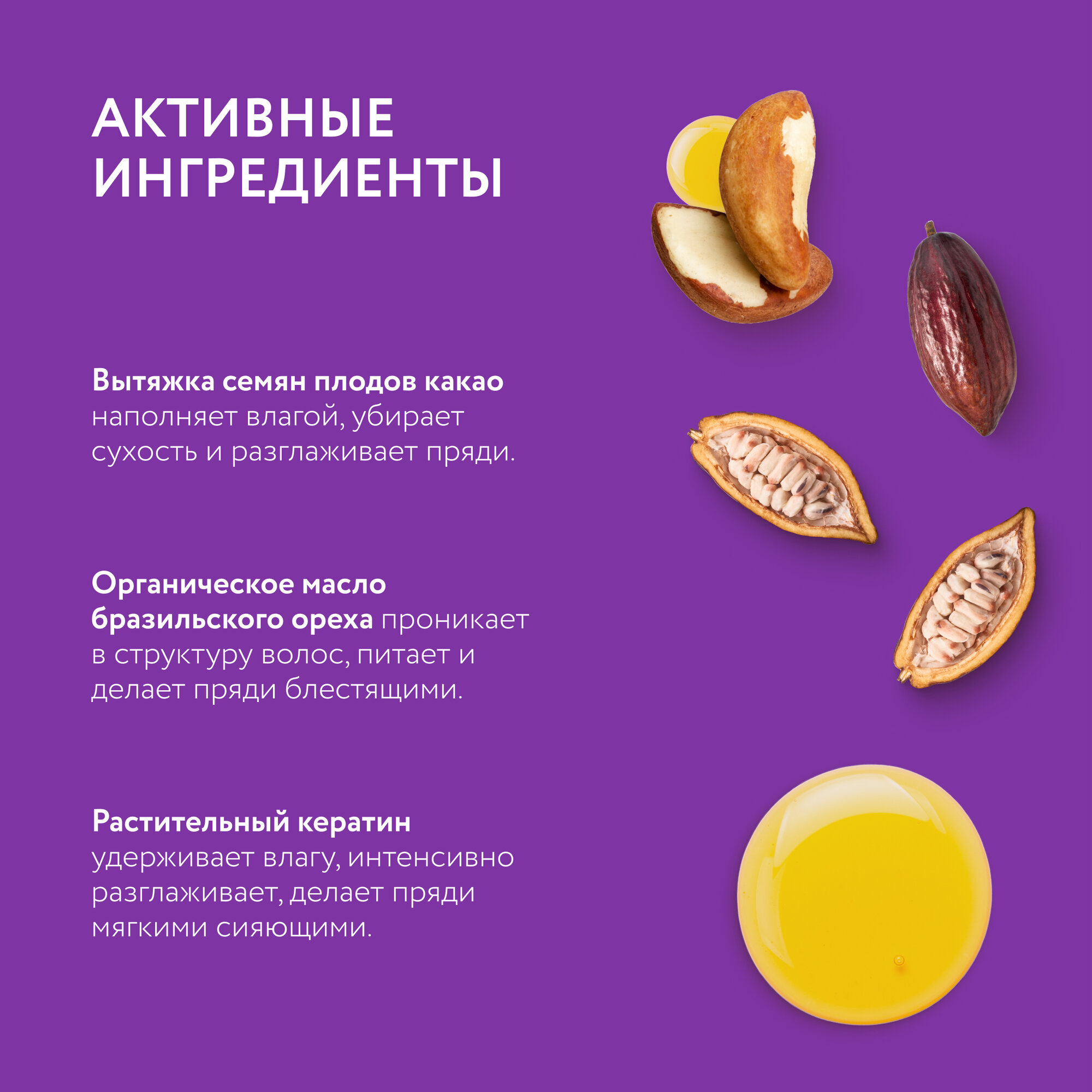 | Состав | Aqua with infusions of Theobroma Cacao Seed Water (вытяжка семян плодов какао), Сetearyl Alcohol, Glyceryl Stearate, Сetrimonium Сhloride, Lauryl Glucoside, Glycerin, Organic Bertholletia Excelsa Seed Oil (органическое масло бразильского ореха), Hydrolyzed Vegetable Protein (растительный кератин), Guar Hydroxypropyltrimonium Chloride, Benzyl Alcohol, Benzoic Acid, Sorbic Acid, Citric Acid, Parfum, Limonene, Linalool, CI 14720. |