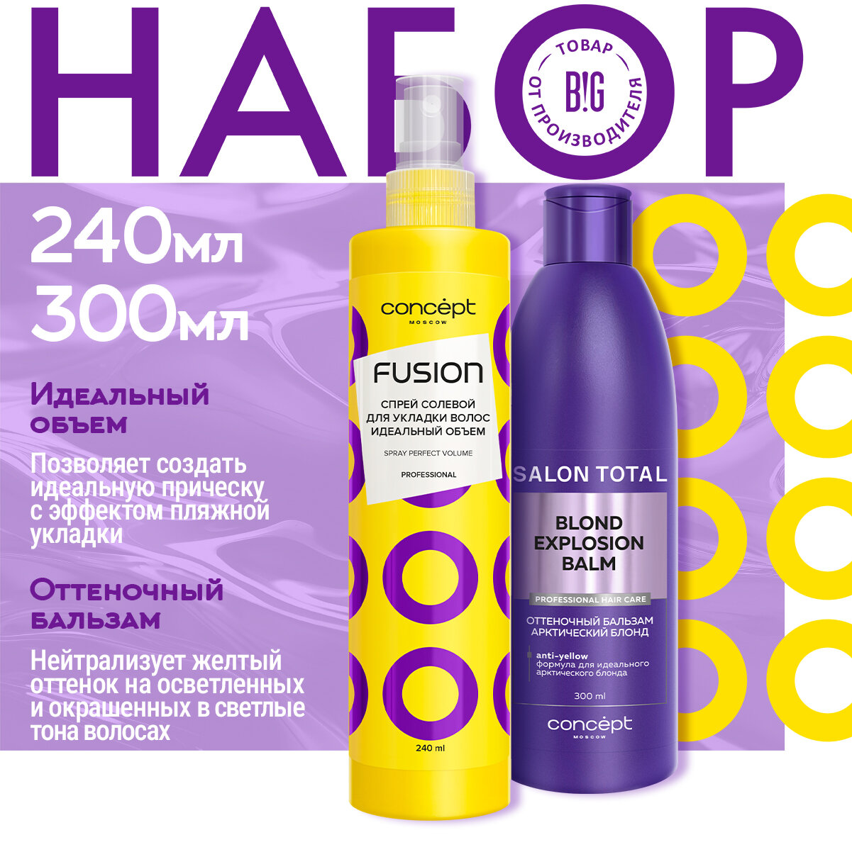 10 цен на Concept Оттеночный бальзам Эффект арктический блонд, 300 мл Blond Exp + Concept Fusion Спрей солевой для укладки волос Идеальный объем Perfect Volume, 240 мл