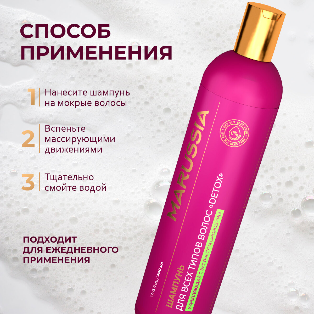 Marussia Шампунь для волос женский мужской укрепляющий DETOX, для всех типов, с экстрактом смородины, 400 мл информация: