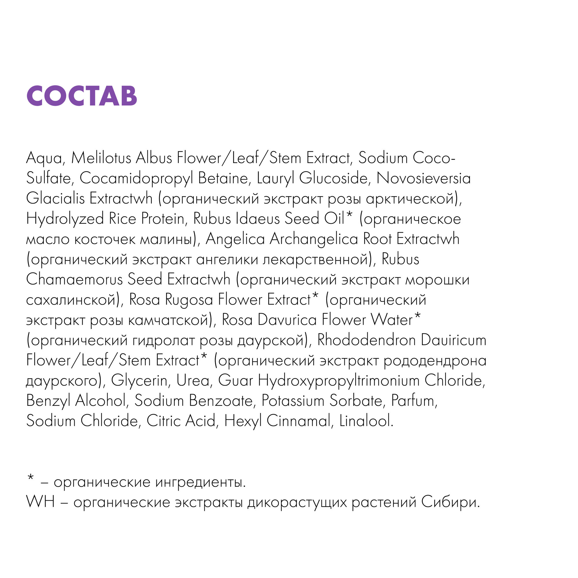 | Состав | Aqua, Melilotus Albus Flower/Leaf/Stem Extract, Sodium Coco-Sulfate, Cocamidopropyl Betaine, Lauryl Glucoside, Novosieversia Glacialis Extractwh (органический экстракт розы арктической), Hydrolyzed Rice Protein, Rubus Idaeus Seed Oil* (органическое масло косточек малины), Angelica Archangelica Root Extractwh (органический экстракт ангелики лекарственной), Rubus Chamaemorus Seed Extractwh (органический экстракт морошки сахалинской), Rosa Rugosa Flower Extract* (органический экстракт розы камчатской), Rosa Davurica Flower Water* (органический гидролат розы даурской), Rhododendron Dauiricum Flower/Leaf/Stem Extract* (органический экстракт рододендрона даурского), Glycerin, Urea, Guar Hydroxypropyltrimonium Chloride, Benzyl Alcohol, Sodium Benzoate, Potassium Sorbate, Parfum, Sodium Chloride, Citric Acid, Hexyl Cinnamal, Linalool. (*) – органические ингредиенты. (WH) – органические экстракты дикорастущих растений Сибири. |