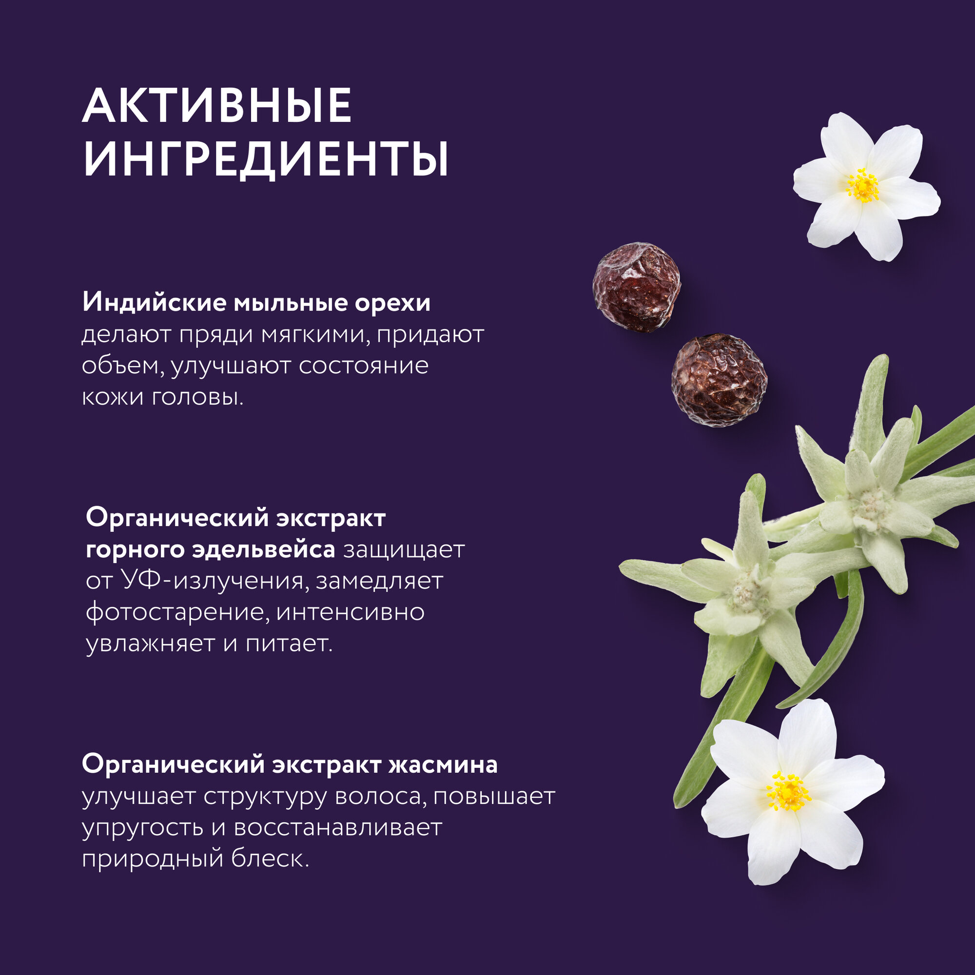 | Состав | Aqua with infusions of Sapindus Trifoliatus Fruit Extract (индийские мыльные орехи), Organic Leontopodium Alpinum Flower/Leaf Extract (органический экстракт горного эдельвейса), Organic Jasminum Officinale Flower Extract (органический экстракт жасмина), Sodium Coco-Sulfate, Cocamidopropyl Betaine, Lauryl Glucoside, Sodium Chloride, Guar Hydroxypropyltrimonium Chloride, Benzyl Alcohol, Sodium Benzoate, Potassium Sorbate, Citric Acid, Parfum, Benzyl Salicylate, CI 28440, CI 14720. |