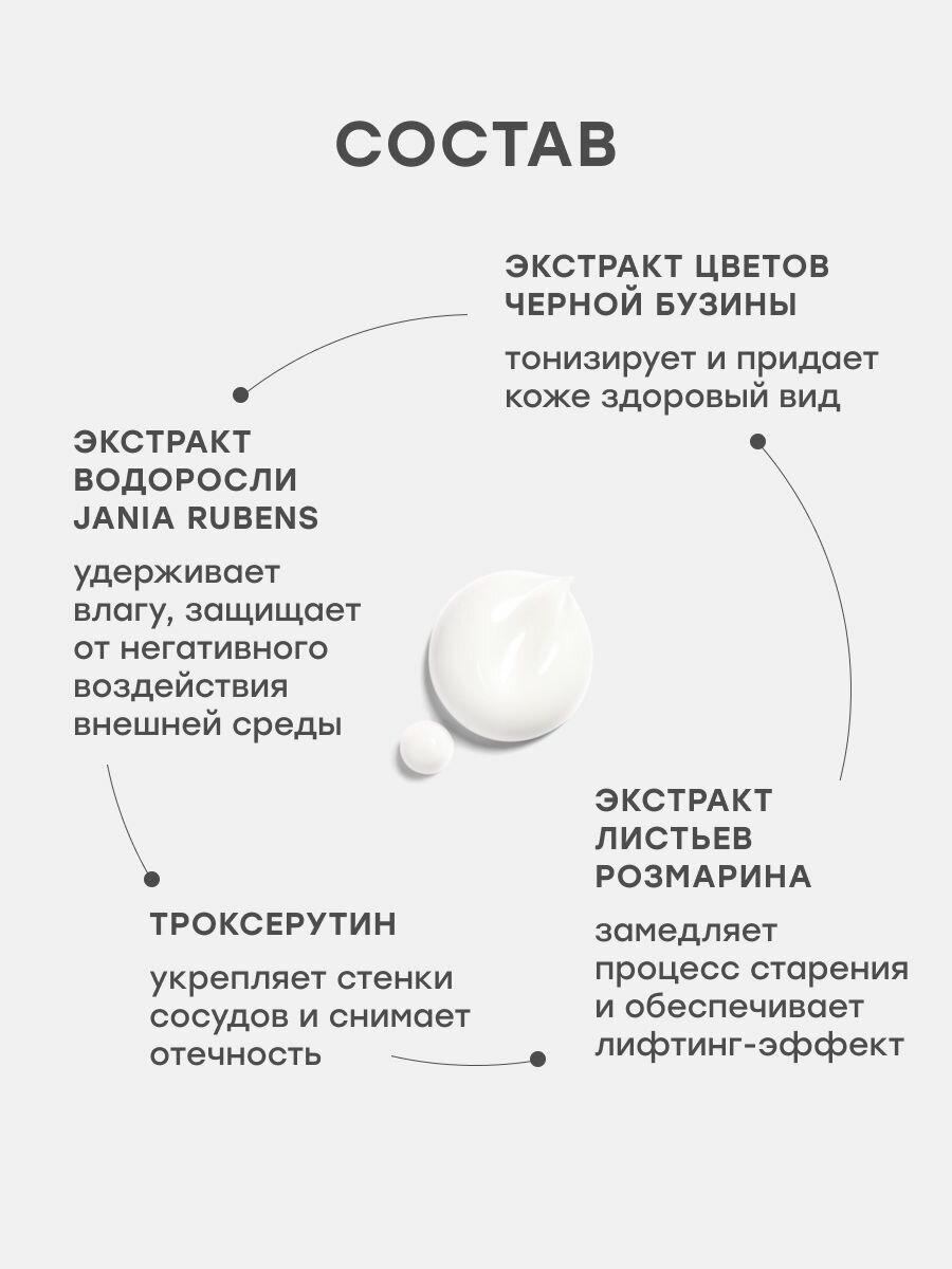 | Состав | deionized water, polyglyceryl-3 stearate, sorbitan stearate, betaine, sorbitol, isopropyl myristate, isodecyl neopentanoate, squalane, caprylic/capric triglyceride, sambucus nigra (elder) flower extract, glycerin, jania rubens (red algae) extract, sodium carrageenan, ethylhexylglycerin, dimethicone/vinyl dimethicone crosspolymer, silica, troxerutin, rosmarinus officinalis (rosemary) extract, trehalose, ammonium polyacryloyldimethyl taurate, parfum, sodium gluconate, phenoxyethanol, butylene glycol, glyceryl laurate, dichlorobenzyl alcohol. |