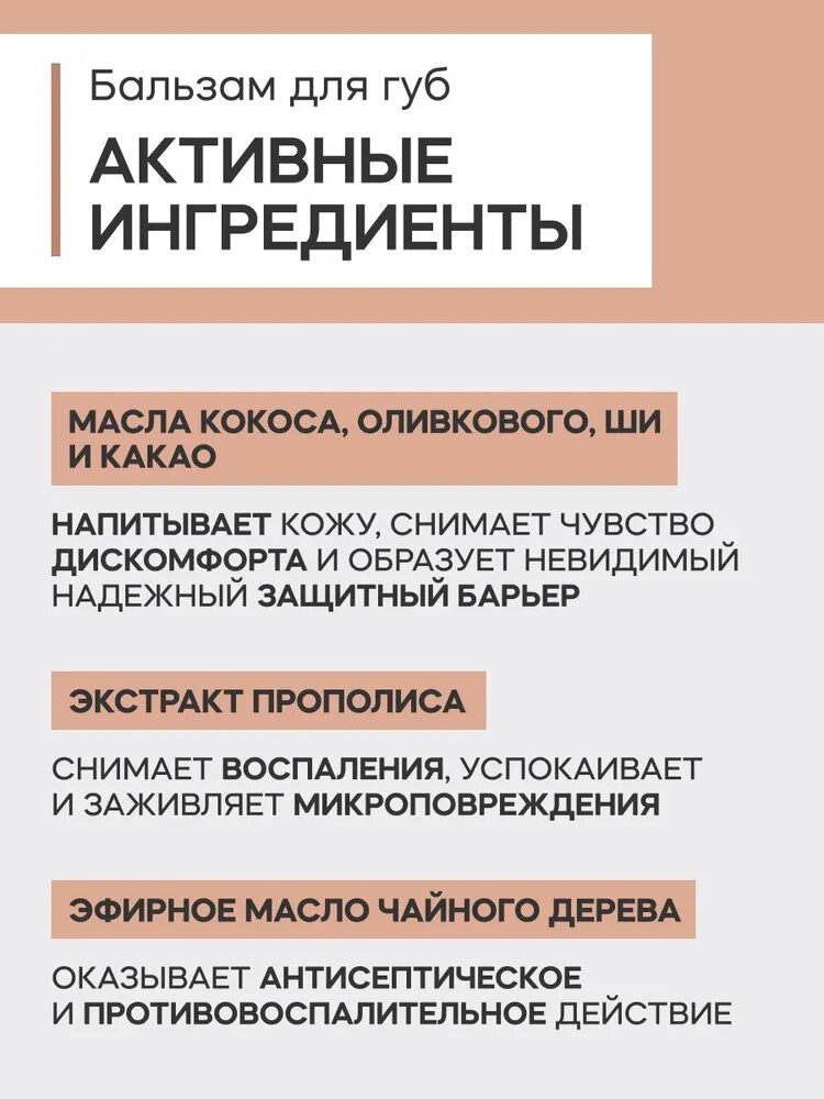 | Активный ингредиент | антиоксиданты / воск пчелиный / кокосовое молоко / прополис |