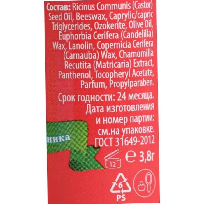 | Состав | Ricinus Communis Oil, Cera Alba, Olive Oil, Caprylic/Capric Triglyceride, Ozokerite, Candelilla Cera, Cera Carnauba, Lanolin Oil, Chamomilla Recutita Extract, Tocopheryl Acetate, Pantenol, Propylparaben, Parfum. |