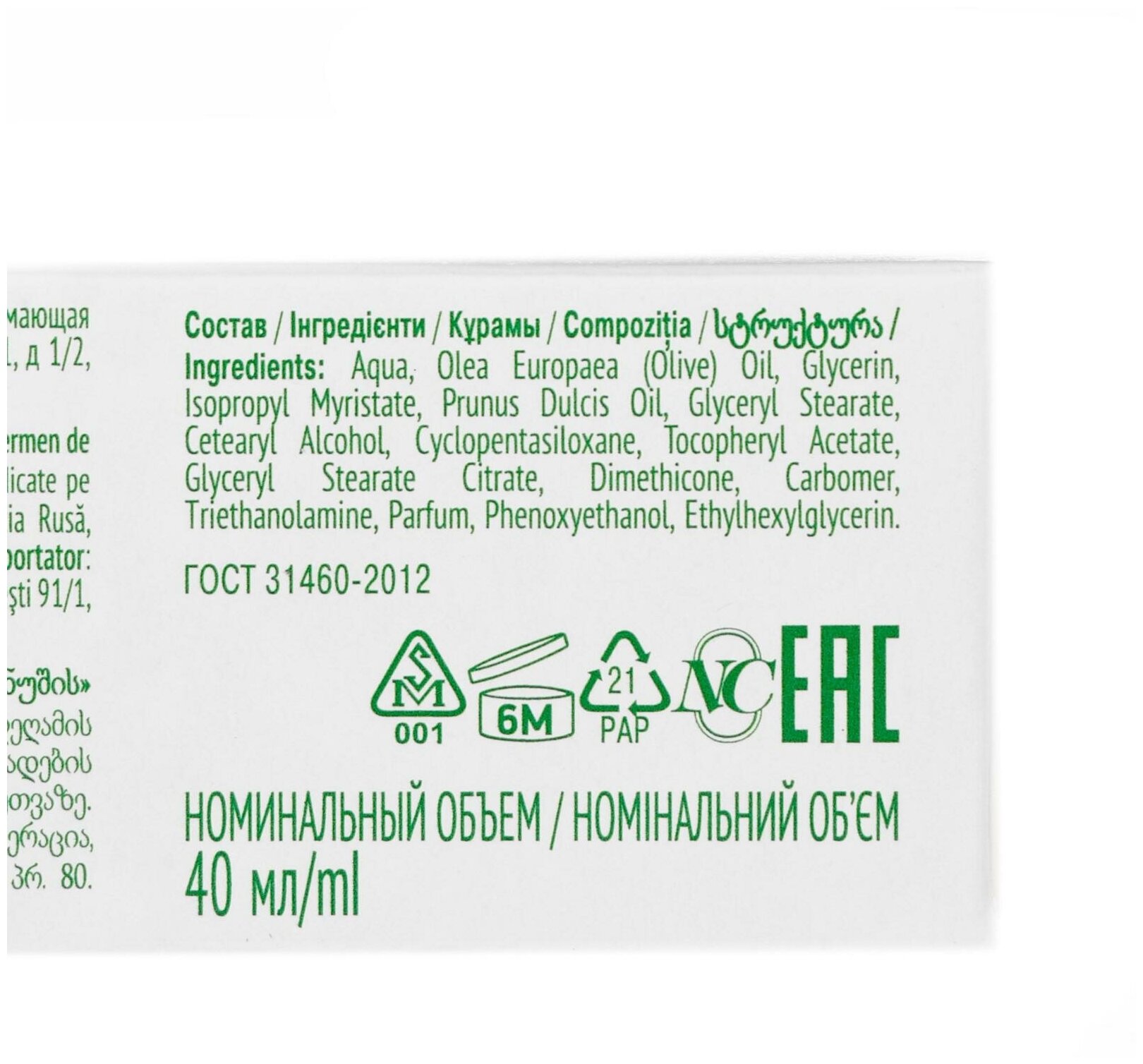 | Состав | Aqua, Olea Europaea (Olive) Oil, Glycerin, Isopropyl Myristate, Prunus Dulcis Oil, Glyceryl Stearate, Cetearyl Аlcohol, Cуclopentasiloxane, Tocopheryl Аcetate, Glyceryl Stearate Citrate , Dimethicone, Carbomer, Тriethanolamine, Parfum, Phenoxyethanol, Ethylhexylglycerin. Вода, масло оливковое, глицерин, изопропилмиристат, масло миндальное, глицерилстеарарт, цетеариловый спирт, циклопентасилоксан, токоферилацетат, глицерилстеарат цитрата, диметикон, карбомер, триэтаноламин, отдушка, консервант. |