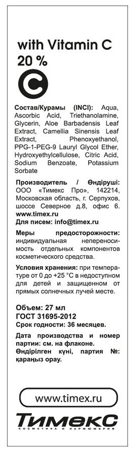 | Состав | Aqua, Ascorbic Acid, Triethanolamine, Glycerin, Aloe Barbadensis Leaf Extract, Camellia Sinensis Leaf Extract, Phenoxyethanol, PPG-1-PEG-9 Lauryl Glycol Ether, Hydroxyethylcellulose, Citric Acid, Sodium Benzoate, Potassium Sorbate |