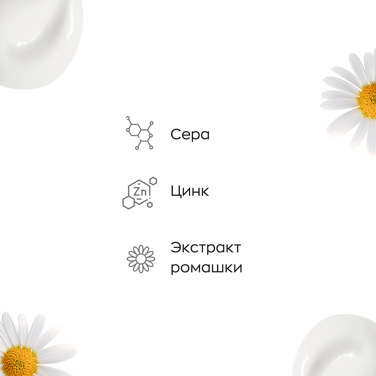 | Активный ингредиент | аллантоин / белая глина / витамин B3 (ниацинамид) / витамин E / витамины / оксид цинка / салициловая кислота / сера / цинк |
