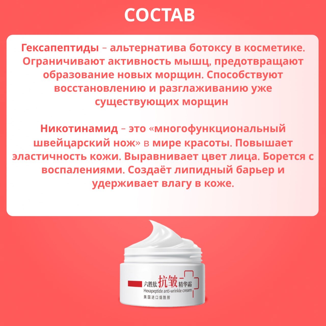 | Активный ингредиент | витамин B3 (ниацинамид) / пептиды |