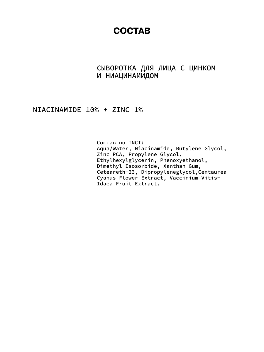 | Состав | Aqua/Water, Niacinamide, Butylene Glycol, Zinc PCA, Propylene Glycol, Ethylhexylglycerin, Phenoxyethanol, Dimethyl Isosorbide, Xanthan Gum, Ceteareth-23, Dipropyleneglycol,Centaurea Cyanus Flower Extract, Vaccinium Vitis-Idaea Fruit Extract. |