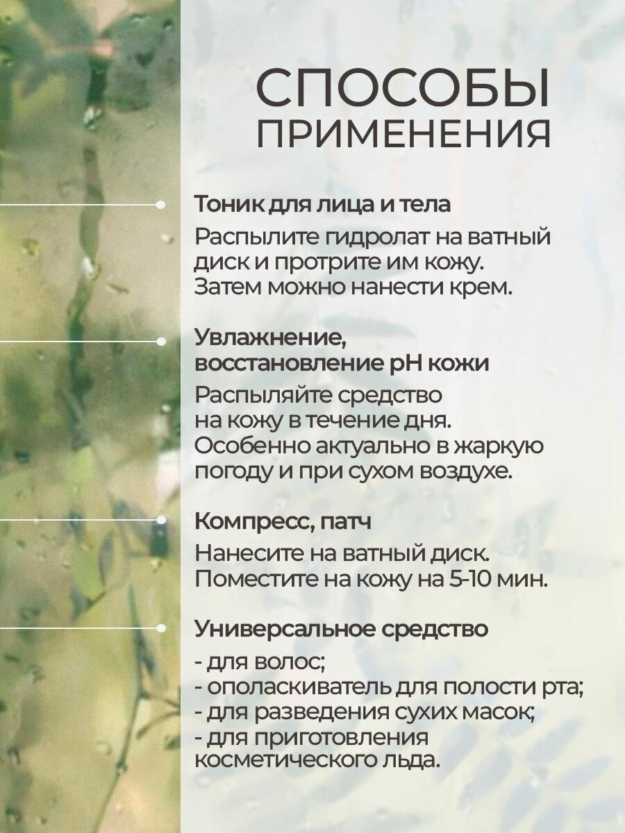 | Способ применения | Распылять на кожу в качестве освежающего средства (тоника) в течение дня по мере необходимости; Для питания, увлажнения и поддержания водного баланса наносить гидролат на ватный тампон и протирать им лицо; использовать в качестве компрессов; в качестве косметического льда по утрам; Для обогащения косметических средств для лица: глину, убтан, сухую маску развести до консистенции сметаны и нанести на кожу; Для ухода за волосами и кожей головы: распылять на корни и по всей длине, на кожу; обогащать косметические средства для волос. |